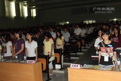 活动开始,全场起立默哀一分钟,向在地震中遇难的同胞们表示哀悼,整个B8厅内一片肃穆。在凝重的气氛中,师生默默祝福灾区人民。