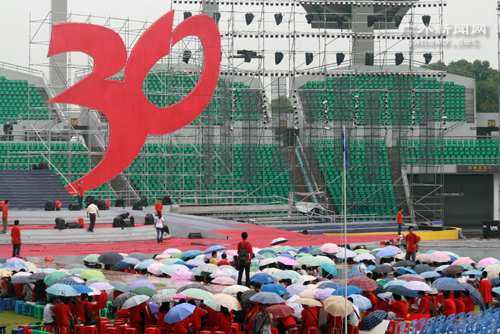 12点30分,我校参加方阵彩排的学生身着统一服装,在学生第二饭堂门口集合后,向体育馆进发。尽管飘着细雨,但他们依旧热情不减,有秩序地坐在舞台前,准备着彩排前的工作。