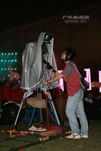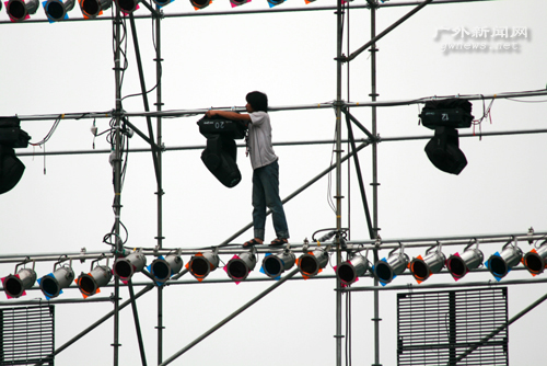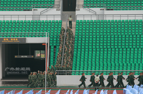 据悉,广州各大学艺术团(华工、华师、中大、广外、广大)、模特队 ,加上广州市青年文化宫100名吉它手、街舞队、极限运动队、广州各大学方阵将参与演出并提前进行排练。作为协办一方,我校方阵队伍自4月29日开始进行统一彩排。5月2日,记者随参加彩排的同学一起,走进体育中心,记录了一群为歌会忙忙碌碌的身影。