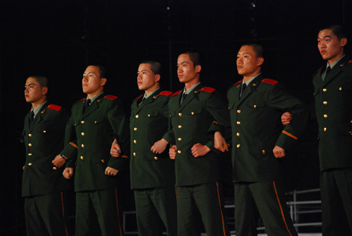 其中,排练队伍里的军绿色更是引人注目。广东边防指挥学校的学员们手挽手铸就“钢铁长城”,恢宏嘹亮的声音响彻全场,他们在排演配乐诗朗诵“感动南粤”。之后,他们排成方阵,表演了刚劲有力的军体拳,引得阵阵喝彩。