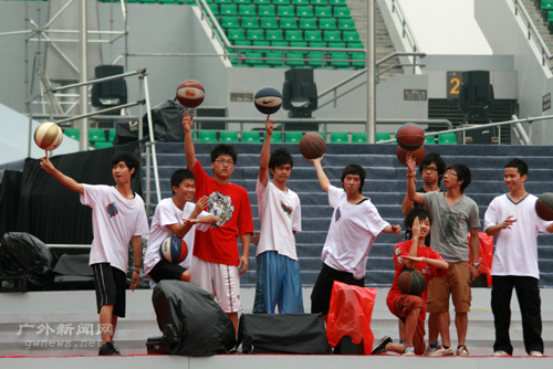 华农男生富于技巧的篮球表演,华师动感的啦啦操,一系列活力四射的表演使整个舞台充满了运动的气息。