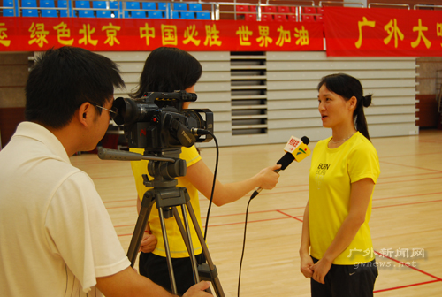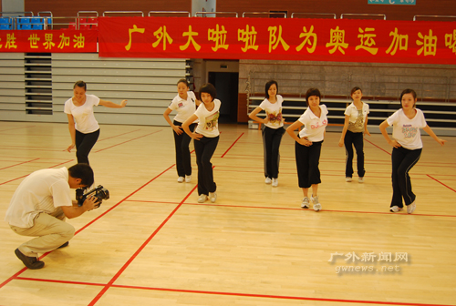 集训场内,队员们在老师的指导下,正在刻苦地训练。《今日关注》进行现场报道。广外啦啦操队的队员们穿上了表演的服装,表演了一套精彩的扇子啦啦操。她们配合默契,动作到位。