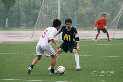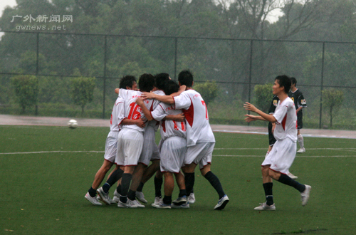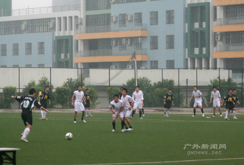 本网讯 4月19日下午,2008年广州大学生足球联赛小组赛全面打响,广外男子足球队赴华南农业大学挑战广东培正学院队,最终,凭借11号钟永强和9号茅荣下半场的两粒进球,广外成功实现雨中大逆转,以2:1反败为胜,取得开门红。