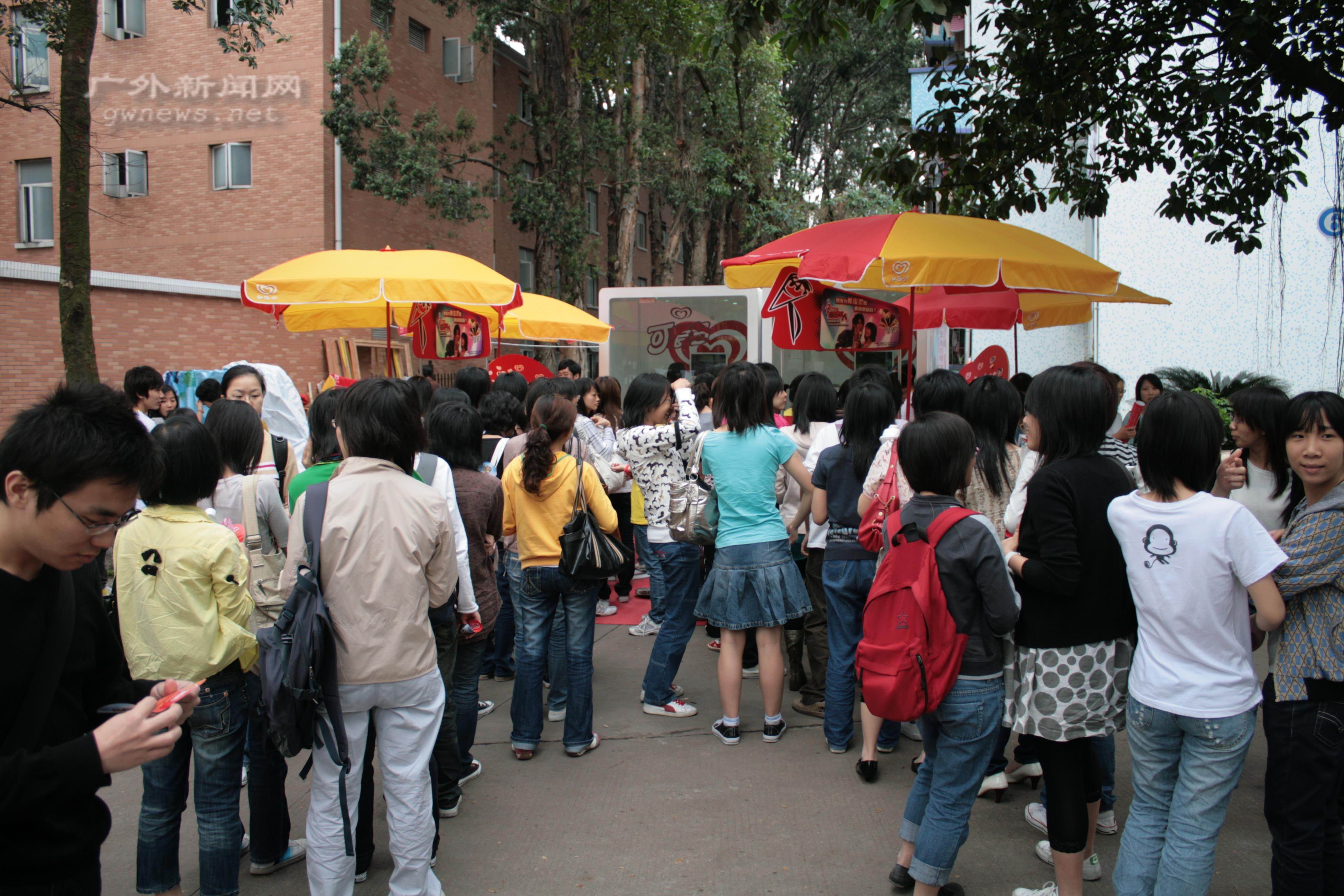 午饭时间,“K房”前排起了长龙。队伍中的学生在接受访问时表示是专门为了“可爱多”而来的。因为可以免费享受冰淇淋,同时还可以过一把“歌瘾”,所以即使要排很长的队伍他们也愿意等。一位正在排队的东语学生告诉记者:“这种活动可以让我们一展个性,很好啊!”