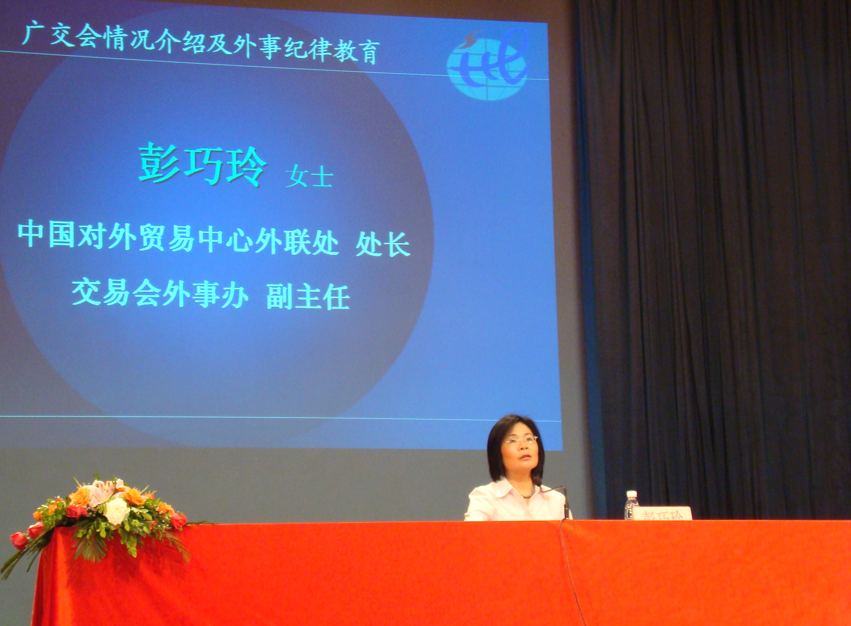 她首先回顾了广交会的历史,并阐述了广交会在国家,乃至于世界的影响力和重要性。之后,她对同学们在广交会将要从事的实习工作做了详细的说明,特别强调了在处理外事事务方面应注意的问题和技巧。彭女士生动、具体的讲解令同学们感触颇深,受益匪浅。她鼓励同学们通过这次培训,统一思想,统一认识,用娴熟的技术和优质的服务完成第103届广交会实习任务。