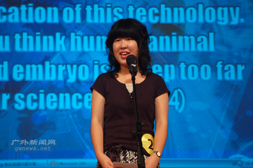 二号选手史书则用流利的英语阐述了对“人兽结合”胚胎的看法,思维清晰,逻辑严密,令人折服。接着,三号彭蓓、四号吴悦、十一号钟珏和十二号李玥霖对抽中的题目都进行了精彩阐述,赢得了观众们热烈的掌声和评委的肯定。