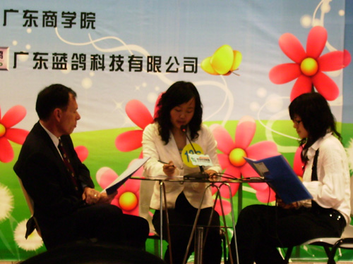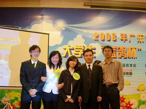 本网讯 3月30日下午一点三十分,广东省首届大学生“蓝鸽杯”英语口译大赛在广东商学院拉开了帷幕。来自十三所高校的十六组选手参赛,其中我校04级学生洪磊、黄冠程、杨婧组成了“Triangle”队代表我校参赛,获得了二等奖的好成绩。