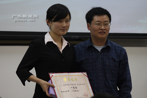 演讲过后,由法学院学生自导自演的“学术性相声”为颁奖大会增添笑料。两表演者诙谐的语调,夸张的动作,不禁让人捧腹。一个曰“我养花”一个答“我养狗”;一个说“我看球”一个回“我看猴”。逗人大笑之际,他俩还不忘与主题“学术”沾边,一本正经地说:“说相声还得寓教于乐,说事还得说理。该笑时笑,讲道理还得发人深省。”在场观众纷纷拍手称赞。