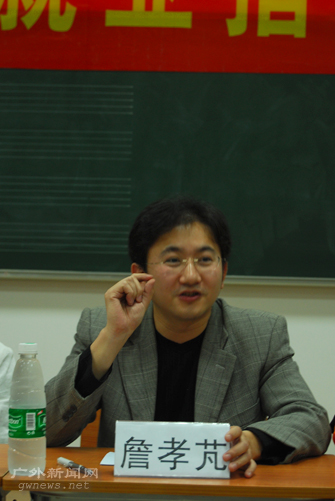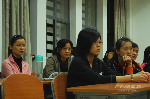 提问环节,同学们都踊跃发言。有同学提出希望能到星海旁听,但担心招来老师和同学的不满。詹孝芃表示,星海欢迎外校学生去听课,也希望借此把广外的良好学风带到星海去。也有同学问到群众文化机构需要人才的素质问题时,詹孝芃回答到,这些机构欢迎的是一专多能的学生,最重要的是有较强的实践能力。
