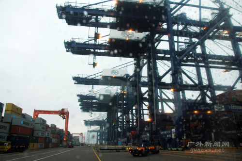 实践队的游览车缓缓开近码头,一座座堆积至五六层的巨大集装箱映入人们的眼帘,近处,装载着各种或空或满集装箱的卡车、堆场巡逻车缓缓驶过;远处,价值上亿人民币的龙门吊将集装箱缓缓吊至空中,叠在下一层集装箱上。呈现一派繁荣有序、欣欣向荣的景象。