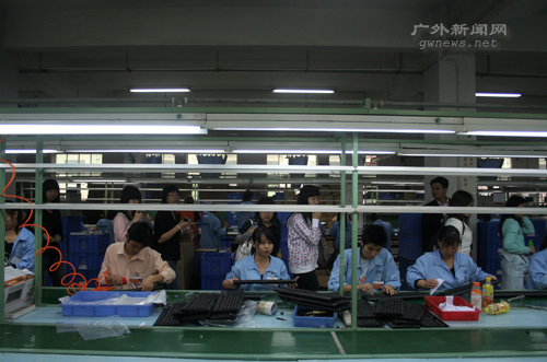 实践队一行人在公司一位负责人的带领下参观了位于沙井的工厂。 深圳沙井新工厂建立于2006年初,占地面积约10000平方米。 有12条标准生产线,自主拥有冲压、注塑和喷油丝印等多台大型设备。据负责人介绍,工厂内主要生产鼠标、键盘以及摄像头。工厂内采用流水作业,一天可以生产鼠标10000只,键盘1500个。