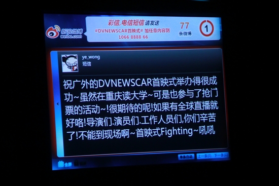本届首映式特别推出了新的环节-----短信微博互动,观众可以发送短信或微博﹟DVNEWSCAR首映式﹟+任意内容参与现场互动。整个首映式共收到约340多条微博,大屏幕上不时滚动出现观众的影评及来自各方的贺电,大大拉近了观众与舞台的距离。这种实时性的互动,及时收集了在场观众的反馈,给了他们畅所欲言的平台,成为本次首映式较之前几届的最大亮点。