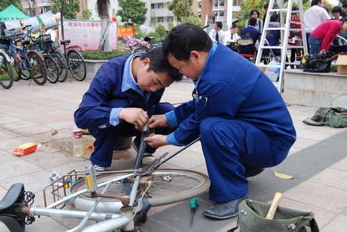该点的服务内容看似琐碎,但却能切实解决人们日常生活中的小问题,因此吸引了不少教职工的光临。刚开摊短短几分钟,便有十几位教职工推着自行车而来,有的是要修脚踏,有的补轮胎,还有的修车链。无论自行车有什么毛病,师父们都应付自如。另外,农药和花肥并不缺乏魅力,很多喜爱种植花草的教职工都陆续前来咨询。一位被访女教师手里拿着花肥,笑着跟我们说道:“我之前一直愁着去哪买花肥,现在走出家门几步就可以买到,真方便!”