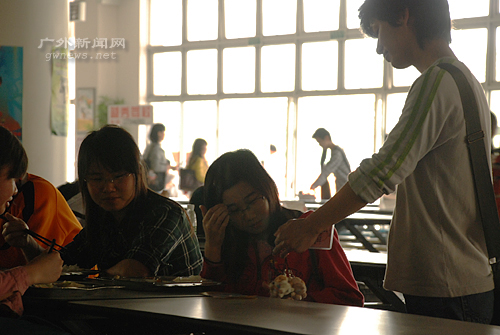 谢炎华向在饭堂就餐的学生兜售物品