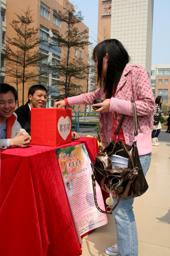 本网讯 3月3—4日,由我校后勤处发起,校工会、校团委以及校学生会联合联合倡议,名为“赠人玫瑰,手有余香——救治急需换肾员工捐款”的活动在南北校区共同进行。两个校区均设了多个募捐点。全校师生积极响应,向重病中的管仙华伸出了援助之手。