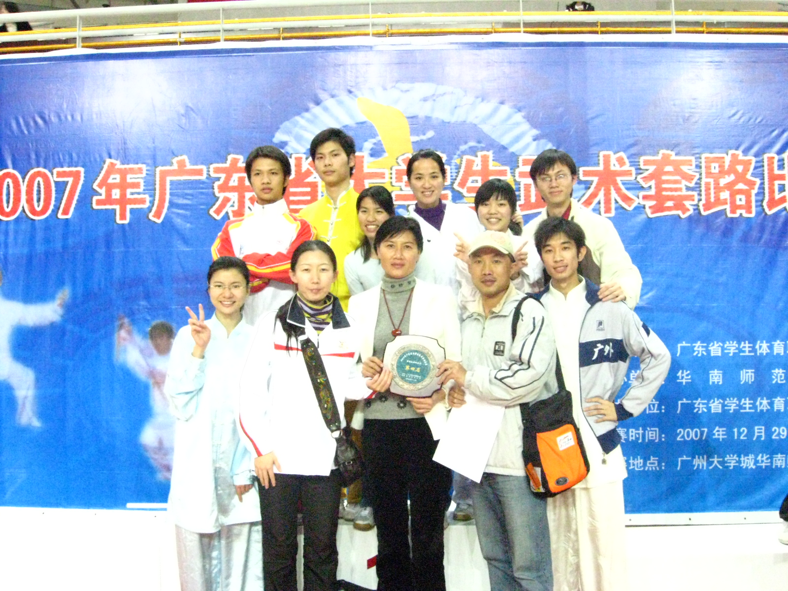 今年广东省大学生武术套路比赛是由广东省体育联合会主办,于12月29日、30日在华南师范大学大学城校区体育馆举行。比赛分高水平组和普通组,包括拳术、短器械、长器械和对练的四大项目。我校余中老师和范洁老师担当此次比赛我校武术队的教练,体育部林少娜老师也亲自到场为运动员加油。