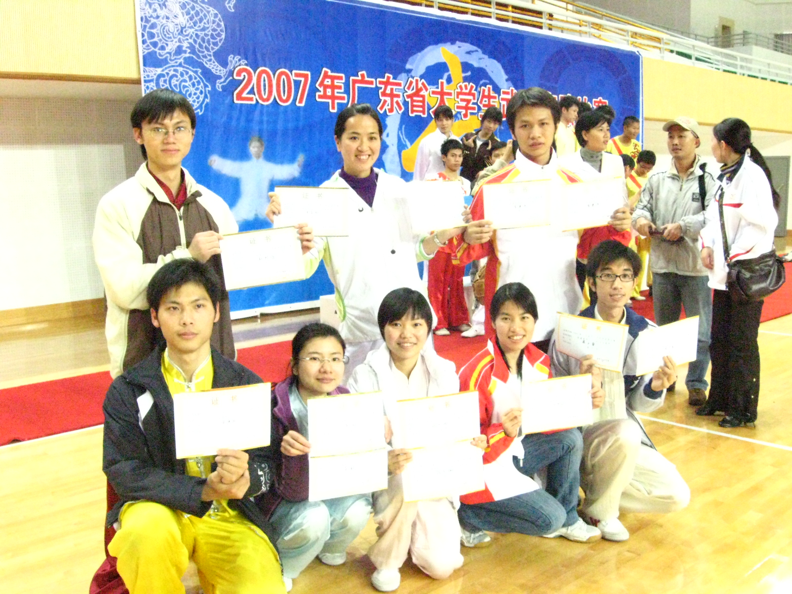 本网讯 在12月30日结束的2007年广东省大学生武术套路比赛中,我校武术队全力以赴,荣获此次比赛中三人对练、太极拳、太极剑三枚金牌,长拳和枪术两枚银牌,取得普通组团体总分第四名的好成绩,获得了历史上的突破。