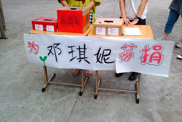 自4月19日以来, 英文学院团委、学生会、学生勤工助学中心、邓琪妮亲友团等纷纷成立筹款队伍,通过微博、QQ、人人网、设募捐箱等渠道开展“爱心救助邓琪妮”的筹款活动,并随时更新患者病情。校领导、各部门和学院的领导及老师、广外全体学生、各中小学生纷纷为邓琪妮捐款,截止至今全校师生筹集的捐款已达16万余元。其中,经贸学院白血病患者张雪婷的父母也以其女儿的名义捐款1000元。此次活动还引起了社会各界的关注。南方都市报、新快报分别对邓琪妮的病情进行了跟踪报道;新城市投资控股集团董事长曹志伟得知了琪妮的病情后,以公司名义捐献了6万元人民币,并表示将来如果有需要,该公司可以提供来公司实习的机会,希望帮助琪妮家庭减轻经济负担。