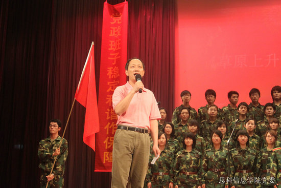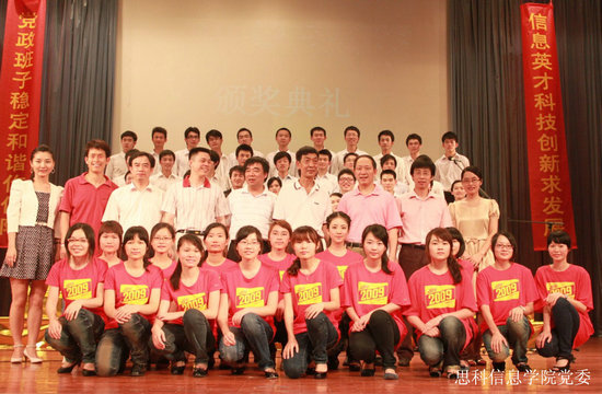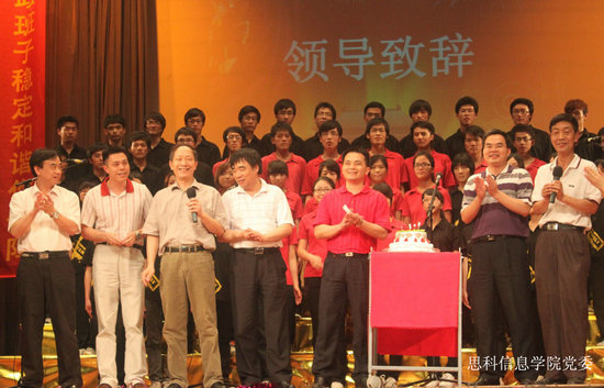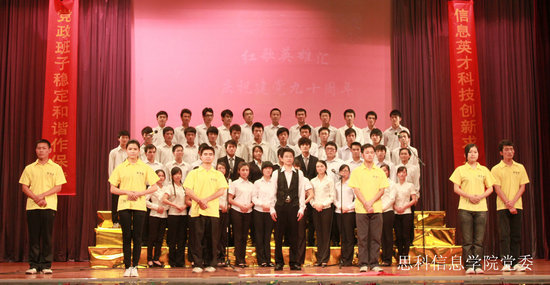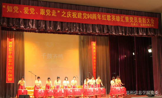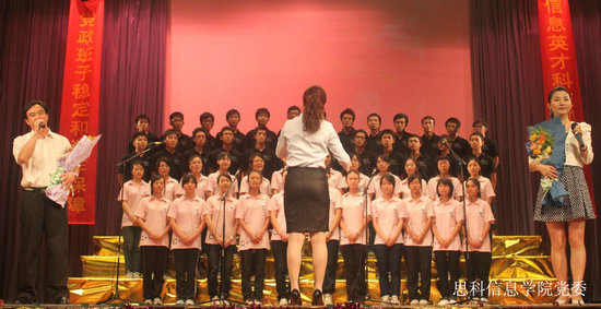 本网讯 4月27日晚,由思科信息学院党委举办的“知党,爱党,跟党走”庆祝建党90周年红歌英雄汇暨党员表彰大会在学术报告厅隆重拉开序幕。校组织部特派组织员徐文权、学生处处长植秀聪、英语教育学院党委书记林绍雄、校团委副书记陈兵、思科信息学院院长姜灵敏、党委书记马庆华、副书记曾智鹏、各级辅导员和家长代表等出席了本次晚会。