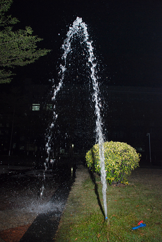 本网讯 1月6日晚八点,教学楼A座前靠近旗杆的草地突爆水管,伴随着“砰”的一声,三四米的水柱高高喷起,草地一时成了喷池。闻讯赶来的物管工程部管理员及时关闭水闸并对水管进行抢修。