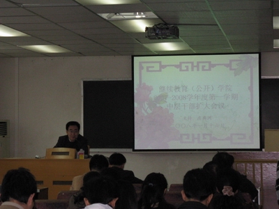 本网讯 1月16日上午,继教(公开)学院07—08学年度第一学期中层干部扩大会议在3教220室召开。大学副校长顾也力、该院全体党政领导及各职能、教学部门教研室主任(部长)级别以上的干部参加了本次会议。会议由该学院党总支书记庄典洲主持。