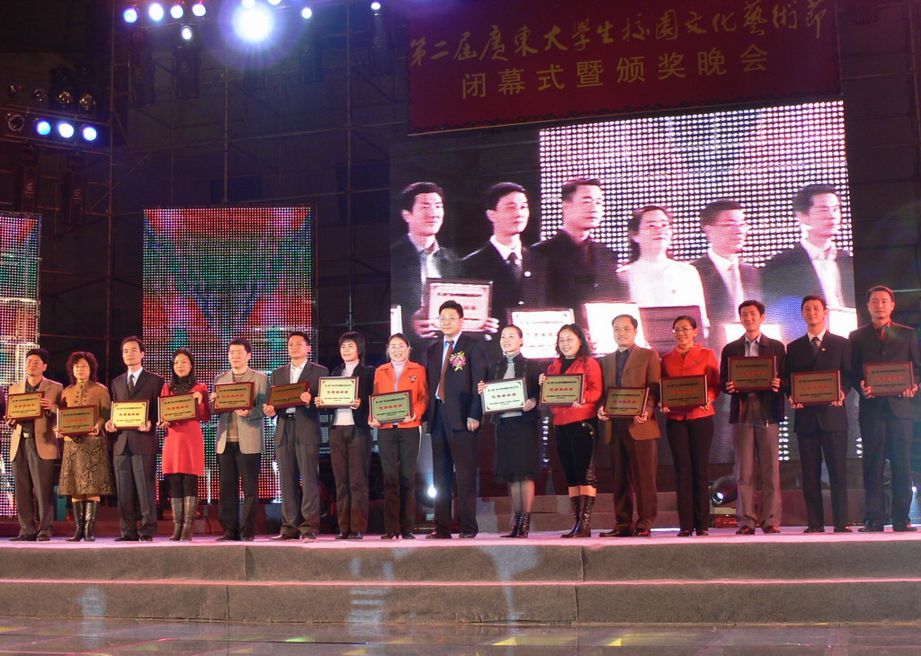 本网讯 12月27日晚,由团省委、省教育厅、省文化厅、省学联共同主办的第二届广东大学生校园文化艺术节闭幕式暨颁奖晚会,在华南理工大学大学城校区体育馆举行。我校党委副书记许国彬、团委副书记谢秀兰等老师以及一百多名同学参加了活动。