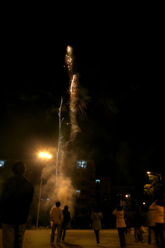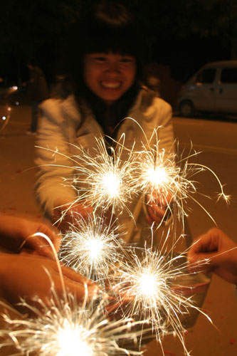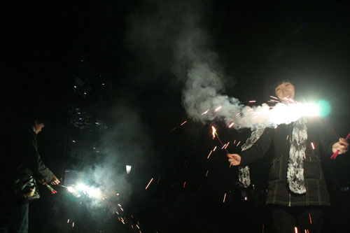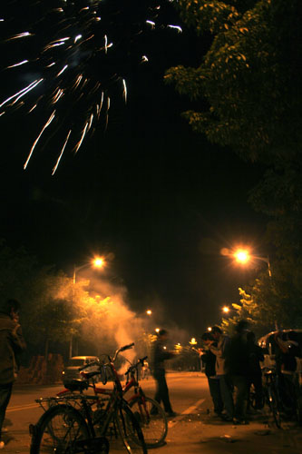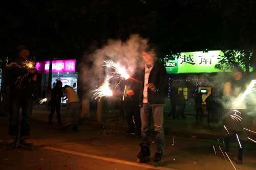 倒数钟声的人群渐渐散去,贝岗开始升温。很多同学都涌到贝岗继续狂欢。夜宵店通顿时火爆起来。马路上到处是玩烟花的男男女女,炮仗声不断。
