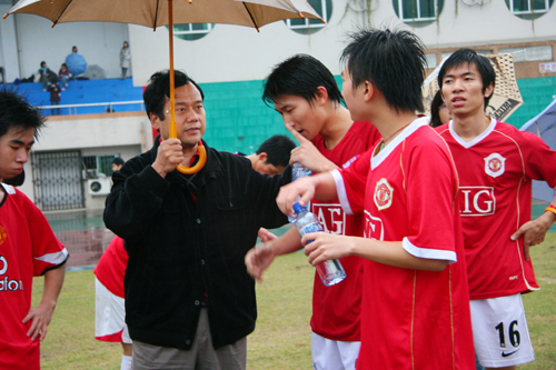 本网讯 速度激情成就梦想,师生竞技共铸友谊。12月23日下午,“师生足球友谊赛”在北校足球场精彩上演,为广外新闻网五周年系列庆祝活动打响头炮。由宣传部部长孔晓明任教练的广外新闻社足球队身穿红色球服,迎战白色球服的教工足球队。经过雨中的角逐,配合默契的教工队以3:1战胜刚组建不久的新闻社足球队。