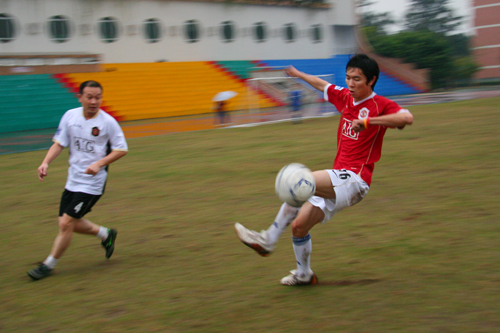 一开场,两队均受场地湿滑的影响,未能很好地控制住脚下的球,只是在中场上一来一回地争夺。待熟悉了场地后,白衫军掀起了一波猛烈的进攻浪潮,一幕幕精彩场面牵动着场外观众的心,或呐喊,或惋惜。上半场比赛几乎呈一边倒形势,场上局面被白衫军牢牢控制。但新闻社代表队斗志未减,尤其是新闻社代表队的守门员梁浩明表现不俗,一一化解了教工队多次有威胁性的射门。上半场后半段,白衫军中的陈静老师在中路接过由队友从底线传来的球后,在中路抢点头球破门,首开记录。随后,杨敏生老师在红衫军禁区前突破对手的双人包抄后推射破门,再为教工队增添一个进球。