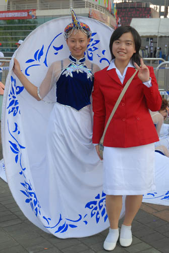 看到各个代表团的一些运动员代表。穿着具有民族特色的衣服,很是新奇。于是和他们交谈起来。