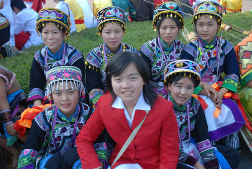 有土家族的少年,十几岁,表演节目;有蒙古族的赛马选手,穿着大红的蒙古袍;有朝鲜族的演员,穿着粉红色的衣服;有苗族的姑娘们,戴着苗银的头饰……