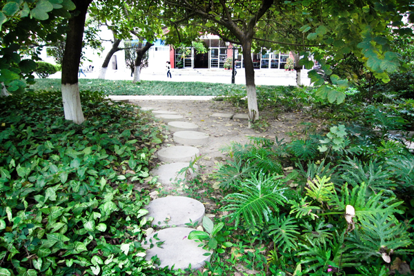 但是,你却不一定知道,沿着小猫们卧着的小路往里面走,是它们的秘密花园。绿树掩映,芳草丛生,一个个圆如玉盘的石桩,连缀成了一条弯弯曲曲的小路,如同一条精致的白色珍珠项链洒落在绿荫里。