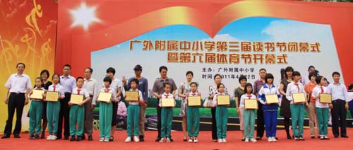 闭幕式的表演也同样精彩。相声《三句半》幽默风趣;初中生的演讲热情洋溢;小学生的古诗文朗诵声情并茂……2011年广外附属中、小学开放日活动及第三届读书节闭幕式颁奖暨第六届体育节开幕式在欢乐的气氛中圆满落幕。