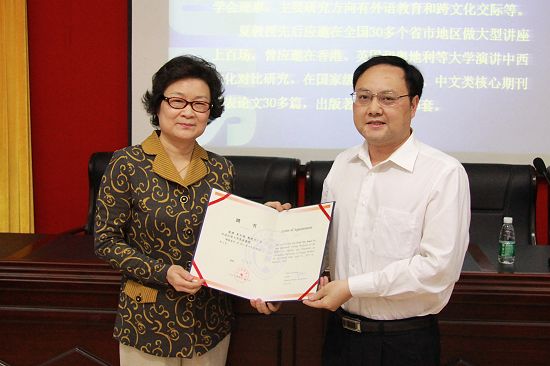 本次讲座由我校英语教育学院承办,副校长石佑启、人事处副处长谢文新出席了讲座。讲座由教育学院院长霍海洪主持。石佑启代表我校向夏纪梅颁发客座教授聘书,并赠送纪念品。