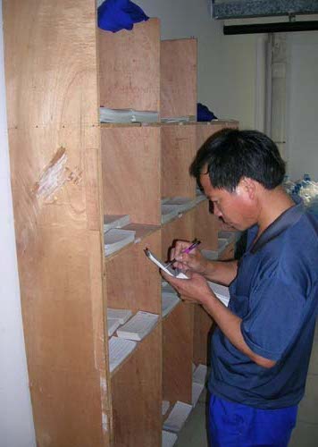 工作人员填写送水卡,记录宿舍的订水情况