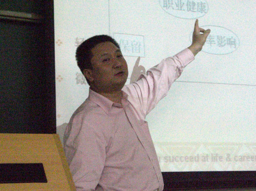 周鉴斌援引数据,向大家展现了2007年大学生就业的严峻状况后,启发同学思考“如何找到自己的职业蓝海”这一问题。“唯有另辟蹊径方可获得就业和事业的成功!”他严肃指出大学生职场生涯中几大风险:就业指导思想之风险、投递求职材料之风险,面试、签约、报到以及跳槽之风险。针对这些风险,他就自身求职和招聘的经历现身说法给大家以许多宝贵建议和巧妙方法,其幽默诙谐的语言,生动精彩的案例分析博得满场掌声。