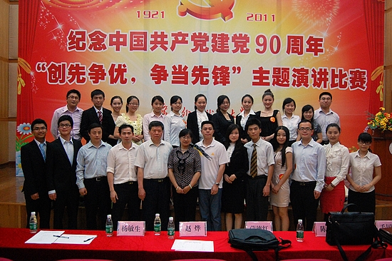 接下来,21位选手各自从独特的角度出发,围绕“创先争优,争当先锋”的主题,真诚地表达了对中国共产党美好的祝福和崇高的敬意。来自财经学院的4号选手吴婕萌同学以“跨长河,从今跃”为题,用若干个的“曾记否”把在场听众带到历史长河的上游:巧夺金沙江、飞夺泸定桥、过雪山、爬草地……为听众呈现了一幅幅惊心动魄的历史画卷。最后以一句“恰如诗曰:数风流人物,还看今朝。”赢得了台下阵阵掌声。东语学院7号选手张洁琳娓娓诉说着汶川地震中中国救援兵的英勇事迹、北京奥运赛场上运动健儿们的累累硕果,还有日本九级大地震中中国对日本义不容辞的相助。感人肺腑,发人深省。而15号选手,来自财经学院的潘俐斌同学则为观众诠释了“使命,成长,奉献”的深刻含义。