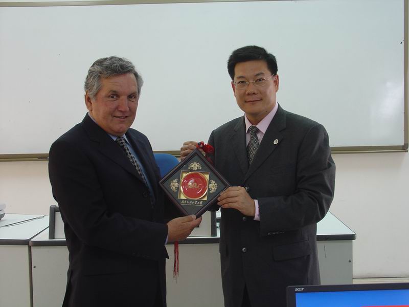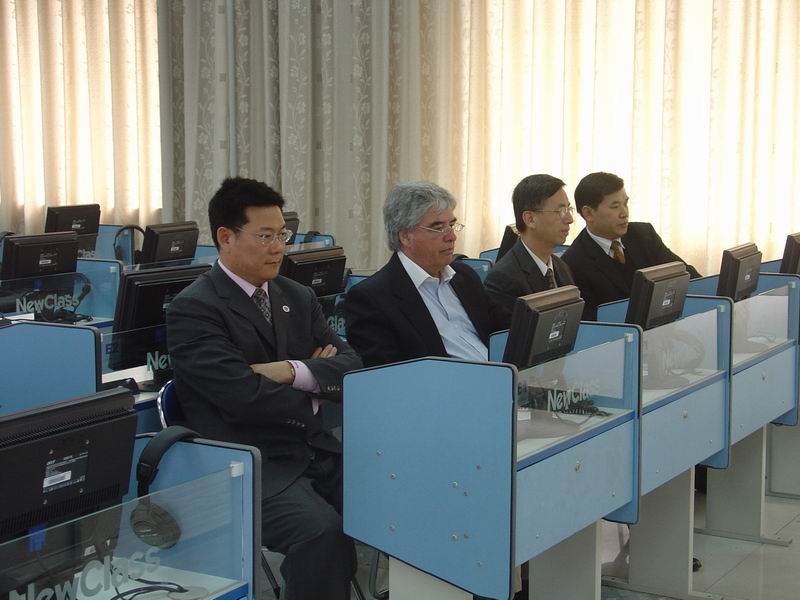 在语言实验室,代表团一行观看了大学城的介绍短片。随后,仲伟合致辞,对代表团一行的来访表示欢迎,并向来宾介绍了学校的发展情况以及与智利高校的合作情况。路易斯•圣特里希斯提到,在参观我校之前,他已查阅过我校资料,但通过实地参观考察后发现我校比网上宣传得要更好。南校区优美的环境和先进的教学设施给他们留下了深刻的印象。此次是路易斯•圣特里希斯第一次访粤。他表示对我省大学城项目在短短时间内的顺利完成表示惊叹,这大大增加了他与我省加强经贸、旅游和教育方面合作的信心。最后,仲伟合代表学校向代表团赠送了纪念品。