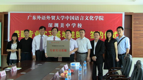 本网讯 4月11日,中文学院院长陈彦辉、党委书记李和民、副院长魏慧斌以及办公室主任、辅导员等人,到深圳美中学校举行共建专业实习基地签约及挂牌仪式,并派送两名对外汉语专业学生到美中实习。