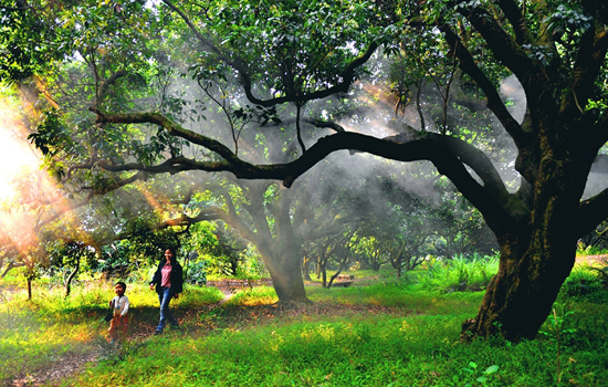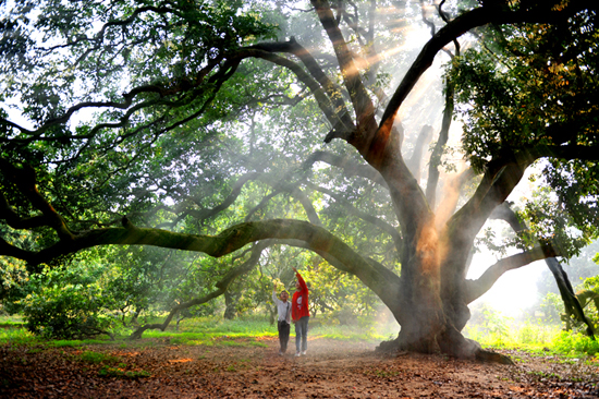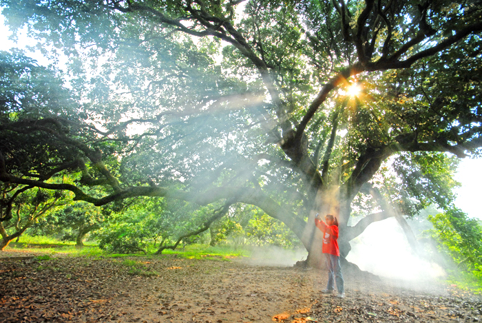 晨光自枝叶间的缝隙倾泻而下,与氤氲升腾的云烟交汇,斑驳耀眼,一幅美妙的光影组合,叹为观止。又添童言稚语,小小身影于荔林嬉戏,悉数入镜。挺掌中相机,定格美妙……