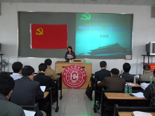 范静静代表学院党委作《紧抓机遇迎挑战,创新党建谋发展》工作报告。报告分为两个部分,第一部分是三年来的工作回顾。三年来,学院开展了形式多样的党建活动:创建党建品牌“党员素质论坛”,建设学习型党组织;实施“十大工程”;倡导制度化、规范化和科学化管理,打造阳光政务;抓好固本强基工程建设;认真做好城乡党组织互助和扶贫开发工作;深入开展创先争优活动。
