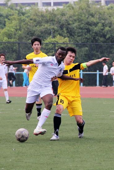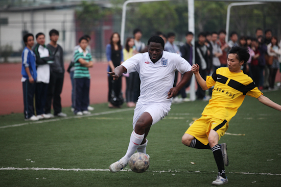 在双方的拼抢中,留学生队凭借身体上的优势,占了不少便宜。不仅依靠身体条件在高空球的控制上占优,脚下技术也十分出色,这让管理防守起来颇感吃力。尤其是场上的几名非洲裔球员,启动速度快,在一对一对话时都令管理后防线头疼。不过,尽管场上队员个人实力不俗,但留学生队整体的组织结构则显得比较凌乱。没能打出团体的配合,而只能依靠个人的技术和速度优势在7人制小场地上反而成为了他们的短板。