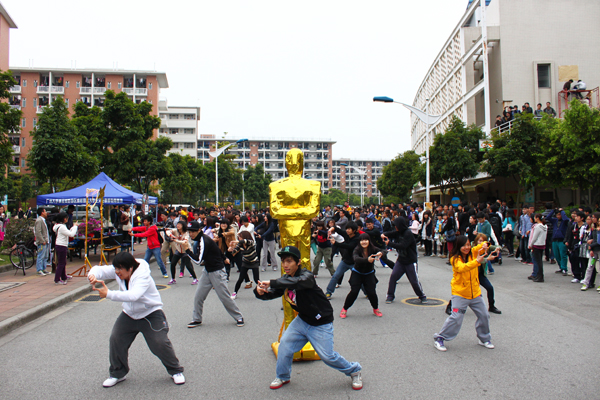 3月23日下午5时20分左右,在又康超市前的校道中央上演了一场二百多人共舞的盛典。该舞蹈以快闪的形式出现,这是快闪在我校的首次惊艳亮相。本次活动由新闻与传播学院团委学生会策划,用于宣传 “广外南都杯第六届DV NEWSCAR”大赛。