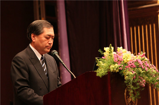 紧接着,广州日本商工会会长杉山泰教发言,他表示中国作为日本最大的贸易伙伴,双边贸易大大促进了中日两国的发展,他寄望同学们能刻苦学习,将来在工商会的日本企业中大显身手,施展才华,促进双方的共同进步。他再次对日本3月11日发生的地震表示深切的哀悼,对仍在灾难中奋斗的民众致予诚挚的祝福,他感谢广州市民温暖关怀和志愿,相信通过自身的努力和国际的帮助,日本定能渡过难关。