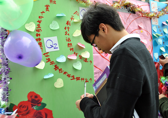 主办方还特别准备了一块精致的留言板——男生说与女生说。路过的女生纷纷留下了自己的心声:“祝自己节日快乐”、“对广外男生今天的表现表示感谢”。男生们也不吝笔墨,有博爱祝福型的“祝广外女生越来越美丽”也有温暖小爱型的“祝我爱的天天开心”。这些美丽的文字正好对应了本次活动的主题——玫瑰让我告诉你。这样的沟通越多,广外的男女生们才能更加相互理解,关爱才会成为一件相互的事。主办方表示,其中的留言将被放到“随手拍解救广外单身”微博上。