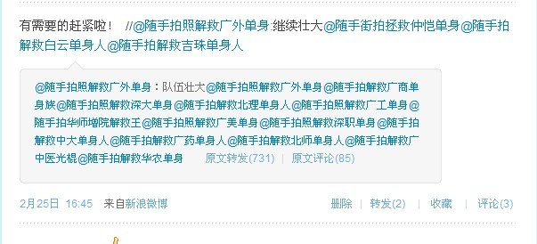 “随手解救广外单身”这个微博随即在广外人当中掀起了一股“解救单身”热。该微博从2月23日23:08发布第一条微博开始到2月28日,粉丝已经超过三千人。最让人惊奇的是,该微博博主苏章浩是东语学院的大一学生,他的背后有一支7人团队,一周轮班,每人一天。谈及微博的创立,他解释说“一开始是看到别的学校有这样的微博。觉得好玩就建了。没想到在广外有如此市场”。别人@他们,他们经过筛选之后,就会转发。这样听起来也许会很单调,但是实际操作起来并不轻松。管理员要定期翻页,认真查看有没有漏掉的信息。尽管工作量很大,管理员还是乐在其中,“因为看到很多人支持是件很开心的事,并且在管理的时候,看到大家的一些评论、推荐的词句很搞笑,心情也就变好起来。”