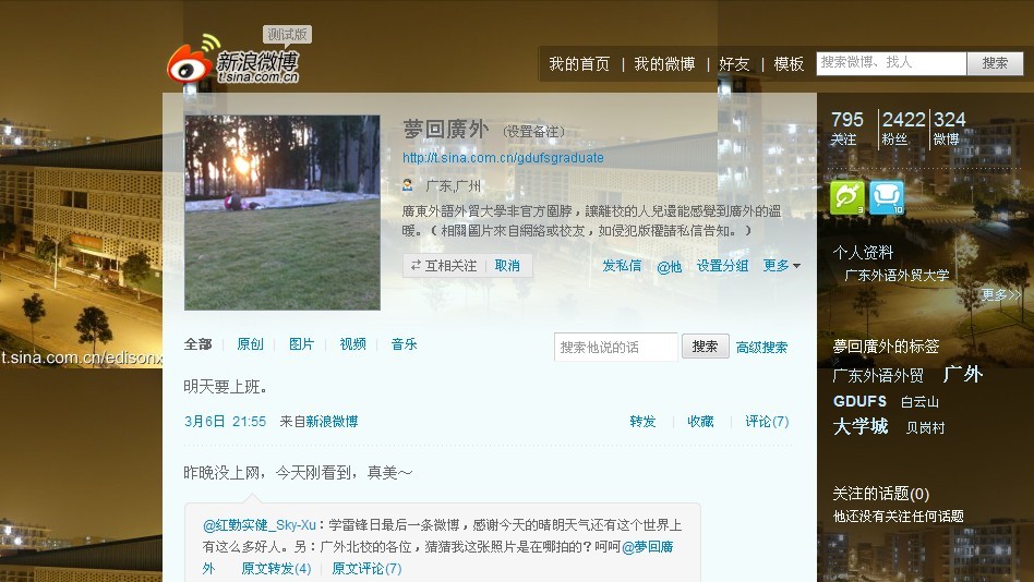 不仅在校学生,一些已经毕业的校友也在微博上有自己的一片小天地。作为一个标准的恋校族,为了“让离校的人儿还能感觉到广外的温暖”,04级新闻学院的蔡同学在2010年10月开通了“夢回廣外”微博。