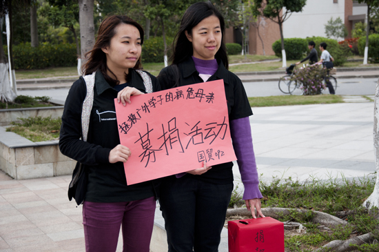 3月7日,广外国贸092班的同学在南校区2栋和12栋楼下进行“拯救广外学子病危母亲”的募捐活动,活动从上午持续到下午。广大师生纷纷慷慨解囊,帮助一位患有尿毒症晚期的母亲。