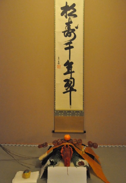 茶席上,“床の間(壁龛。放置供奉物品)”装饰最能体现新年气氛,柳枝长垂,表达对春天的期待,正中悬挂里千家十五代家元墨宝“松寿千年翠”,挂轴下是特意为新年准备的“蓬莱饰”,内含昆布,栗子,柿饼等许多吉祥物件,祝福来宾健康长寿,家庭和睦。专程从天津赶来的里千家专任讲师市川弘伦老师耐心地解释着正月茶会的种种,身着美丽和服的老师和同学们则为客人呈上了茶点。据市川老师介绍,新年茶会素有为点心命名的习俗,这种本名“开运兔”的羊羹,因其色泽通透,如水墨花朵,故命名“つぼみ(蓓蕾)”,象征刚刚起步的佳乐庵茶室。