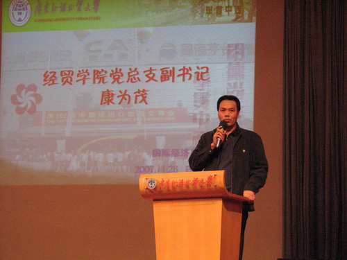 接下来,大会司仪宣读了本届广交会227名“优秀实习生”名单并由陈少伟科长、李和民副处长和康为茂副书记为获奖的各班代表颁奖。康老师表示:在广交会的实习中,经贸学院学子将专业特色与外语优势结合在一起,在实习的同时长知识、增才干,希望同学们在今后的学习中更能抓好专业知识的学习,争取得到更大的进步。